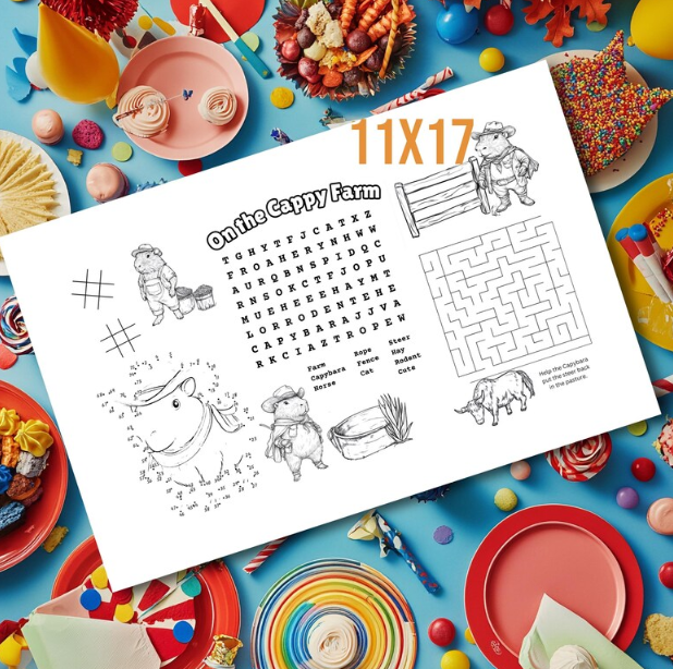 On the Cappy Farm ๐พ๐พโa fun, farm-themed printable placemat packed with capybara charm! This digital download is perfect for kids, capybara lovers, or anyone who enjoys a mix of games and coloring fun. Whether for a farm-themed party, a restaurant activity sheet, or just a boredom buster at home, this placemat has it all!